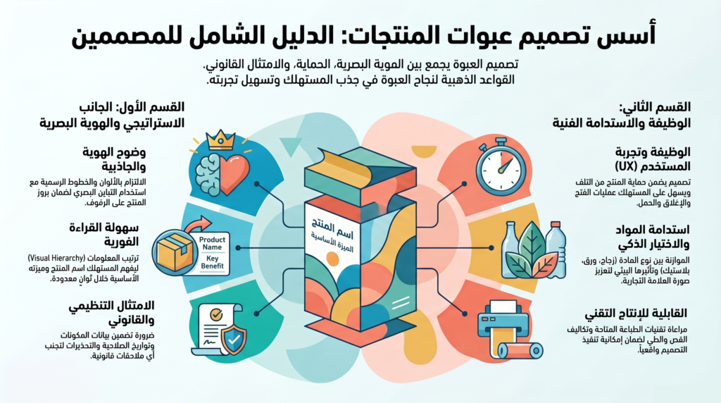 تصميم عبوة المنتج ليس مجرد عنصر جمالي، بل هو أداة استراتيجية تؤثر مباشرة في قرار الشراء، وتُجسد هوية العلامة التجارية، وتؤدي وظائف عملية ولوجستية. فيما يلي عرض منهجي لأهم الأسس التي ينبغي أن يلتزم بها المصمم أثناء تنفيذ عبوة منتج: